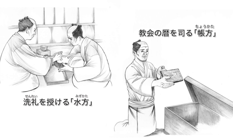 長崎ながさき天草あまくさ地方の潜伏キリシタンは、16世紀以来、集落ごとに根付いた共同体を起源とする「くみ」などを維持しながら、自らの信仰を続けられるよう共同体内の仕くみみを変えていった。それは宣教師に代わって洗礼を授ける「水方みずかた」をはじめ、教会暦をつかさどる「帳方ちょうかた」などの役職を担当する「指導者」を中心として、キリスト教由来の儀礼、行事などをとり行う仕くみみへ変化させることだった。