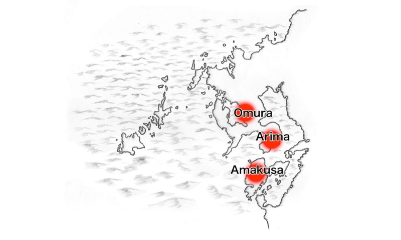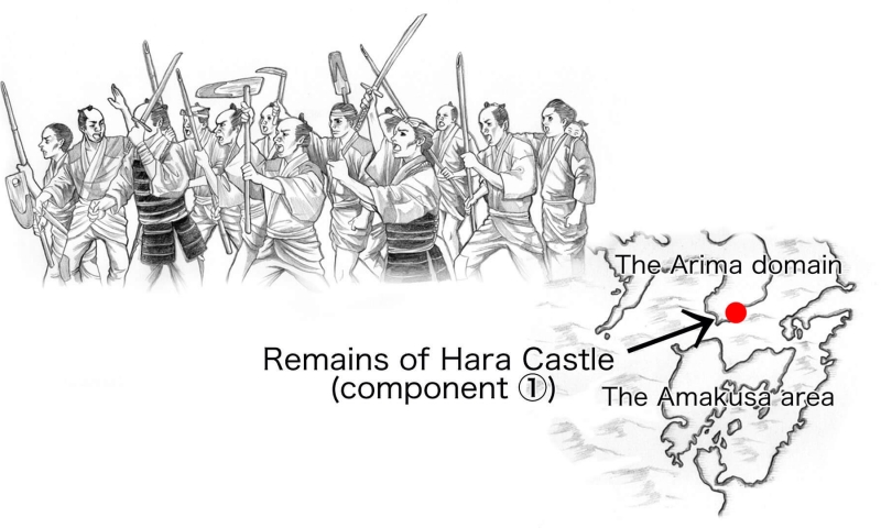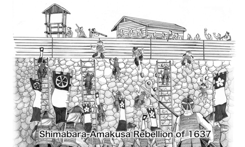 각지에서 엄격한 금교 정책이 실시되고 있던 1637년, 영주의 폭정과 기근을 계기로 아리마 영지와 아마쿠사 지방에서는 백성들에 의해 ‘시마바라・아마쿠사의 난’이 일어났다. 시마바라 지방 남쪽에 위치하고 일찍이 그리스도교가 번성했던 아리마 영지에서는, 영주였던 기리시탄 다이묘 아리마 하루노부(有馬晴信)가 뇌물수수 사건으로 유형을 당한 후 사형에 처해졌다. 이에 따라 그 적자인 아리마 나오즈미(有馬直純)가 휴가 지방으로 영지를 이전하게 되었는데, 그 때 많은 기리시탄 무사들은 영지 내에 남아 영지의 백성들과 함께 기리시탄으로서의 신앙을 지속했다. 아리마 가문의 옛 가신들과 예전 아마쿠사 지방을 지배했던 기리시탄 다이묘 고니시 유키나가(小西行長)의 옛 가신들이 주도하여 그리스도교 신앙을 은밀히 계속하고 있던 시마바라, 아마쿠사 지방의 주민 약 2만 수천 명이 들고 일어나 당시 사용되지 않고 있던 ‘하라 성터’에서 농성을 벌였다. 4개월에 걸친 공방 끝에 봉기 세력은 막부군에 의해 거의 전원이 죽임을 당함으로써 진압되었다.