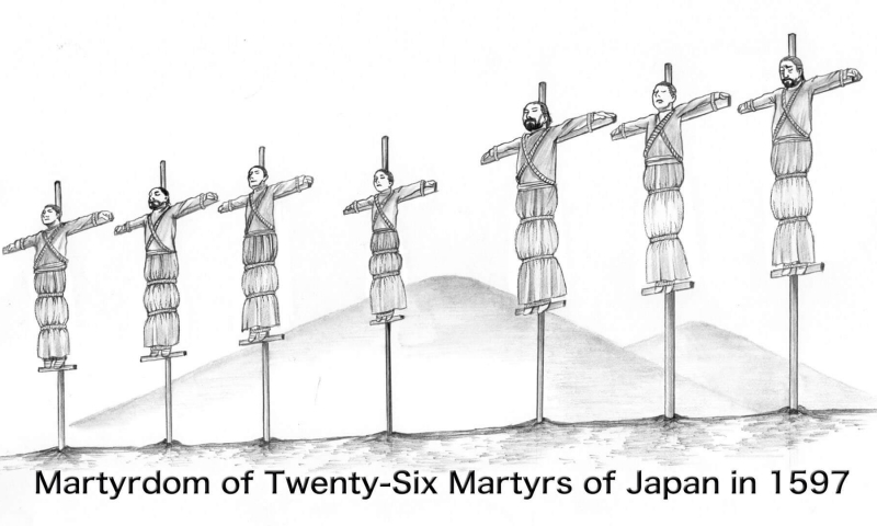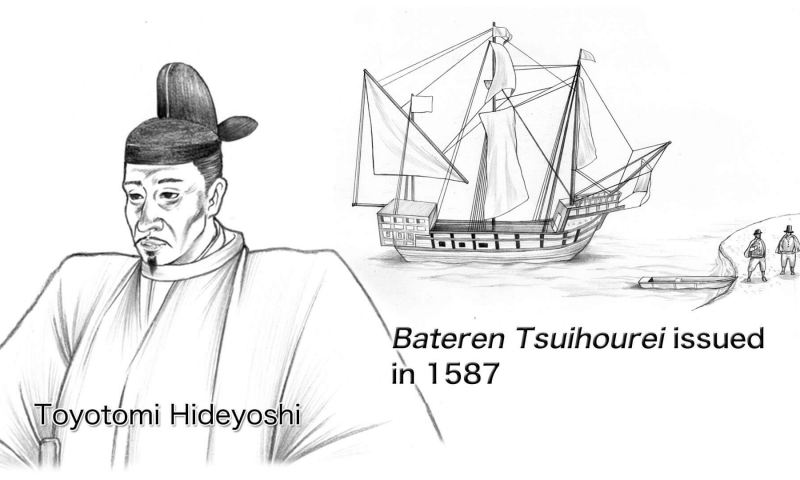 규수, 야마구치 지방 및 기나이 지방을 중심으로 선교가 전개되는 한편, 도요토미 히데요시(豊臣秀吉)는 전란 속에서 일본을 통일했고, 선교사와 기리시탄 다이묘의 결속이 강해져 영지를 양도하는 등 바람직하지 않은 움직임이 발각되자 1587년, 하카타(후쿠오카)에서 선교사를 추방한다는 ‘바테렌 추방령(伴天連追放令)’을 선포하고 예수회에 기진된 나가사키를 몰수해 자신의 직할지로 삼았다. 히데요시는 선교를 금지하는 방침을 내리면서도 무역에 의한 이윤 획득을 중시하여 남만무역을 추진하였기 때문에 ‘바테렌 추방령’은 철저히 시행되지 않았다. 그러나 1596년에 일어난 스페인 선박의 표류 사건을 계기로 선교사가 스페인 영토 확대의 일부를 담당하고 있다는 보고를 받았고, 그에 격분하여 1597년, 기나이 지방에 거주하고 있던 프란치스코회 수도사 6명을 포함해 총 26명의 기리시탄을 체포, 처형하였다. 이른바 ‘일본 26성인 순교’ 사건이다.