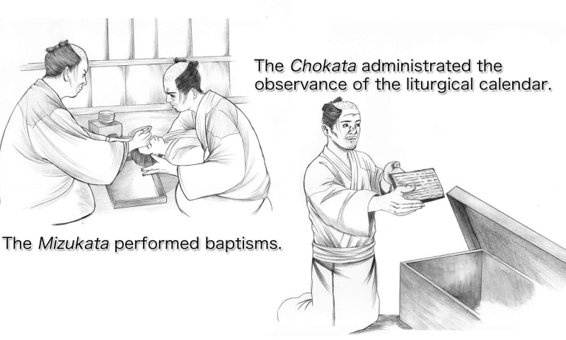 나가사키와 아마쿠사 지방의 잠복 기리시탄들은 16세기 이후 취락별로 뿌리내린 공동체를 기원으로 하는 ‘조(組)’제도 등을 유지하면서, 자신들의 신앙을 유지할 수 있도록 공동체 내부 구조를 변용해 갔다. 이 변용이란, 선교사를 대신해 세례를 행하는 ‘미즈카타(水方)’와 교회력을 관장하는 ‘조카타(帳方)’ 등 역직을 담당하는 ‘지도자’가 중심이 되어 그리스도교 유래의 의례와 행사 등을 집행하도록 하는 구조로 변화시키는 것이었다.