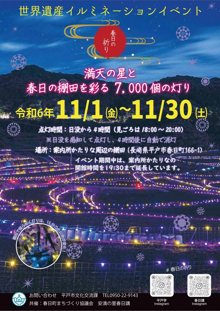 世界遺産イルミネーションイベント「春日の祈り」 世界文化遺産「長崎と天草地方の潜伏キリシタン関連遺産」の構成資産である春日集落でイルミネーションイベントを開催します。 太陽光をエネルギーに春日の棚田を彩るLEDライトは、15分ごとに集落の四季をあらわす色に変化していきます。 イルミネーションイベント期間中は、案内所かたりなも19時30分まで延長して開館しています。